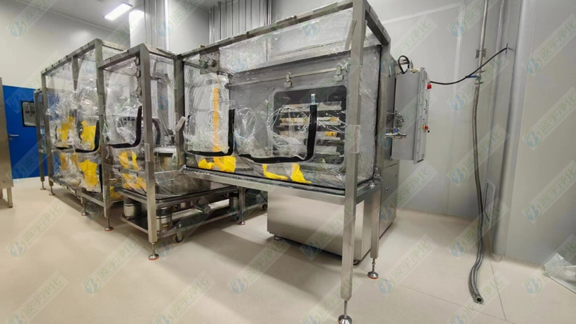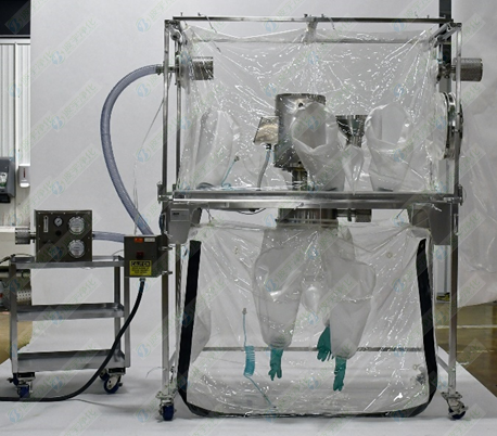 柔性屏障系统集成HAPI物料离心,干燥,粉碎和称重工艺流程. 防护要求可达OEB4(<10μg/m3)。 • 柔性屏障系统和工艺设备快速拆卸,通过液体接口连接离心机接口和废液排放,也考虑通过半身衣进行离心机物料提取。 • 通过柔性手套系统,将物料转移至真空烘箱,手套能够进行烘箱的门的开启和关闭。 • 物料转至锥磨粉碎的过程,上下不同的舱体实现物料的投料和粉碎落料。 • 物料流转至气流粉碎工艺流程,分考虑了气流粉碎机的密闭性,设置了气流粉碎的气体条件。 • 物料流转至称量工艺,内置一个高精度称重系统,称量完成后,通过连续出袋系统进行物料的密闭转移。 产品应用:HAPI物料的工艺制备 保护对象:人员和环境VIEW