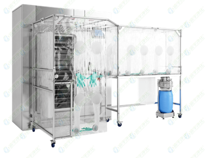 该柔性屏障结构将离心机整体进行围护,充分考虑液体进入离心机的快速拆装接口,人员通过半身服结构将离心机中的物料通过连续出袋进行密闭转移。 防护要求可达OEB4(<10μg/m3)。 产品应用:离心机屏障系统 保护对象:人员和环境VIEW -
